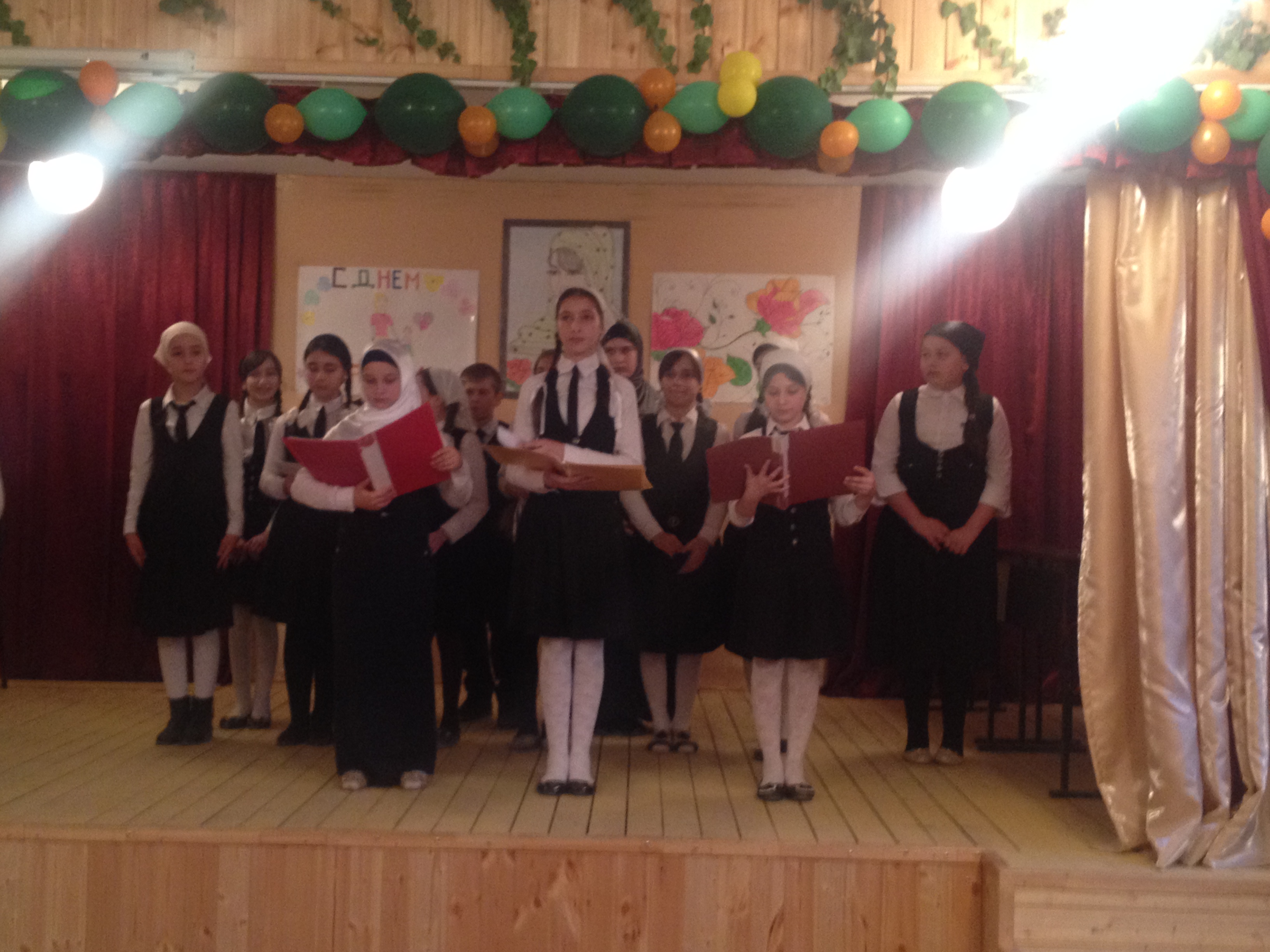 На каждой перемене в течение всего дня в фойе школы звучала музыка, школьный детский хор исполнял песни о доброте, дружбе и любви.